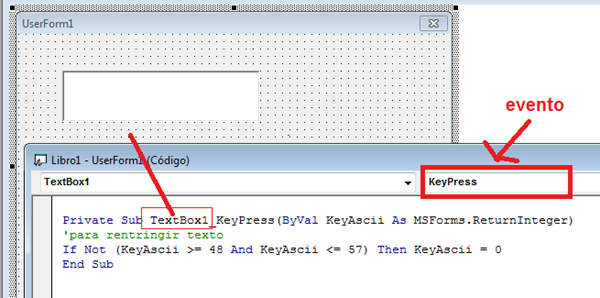He creado un formulario de inventario en excel con etiquetas de codigo-fecha-refererencia- producto - descripcion - entrada y salida yo necesito retringir algunos texbox para que sea solo texto en unos casos solo numero mejor copio los datos que tengo en visual basic para que lo vean.