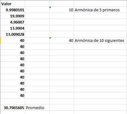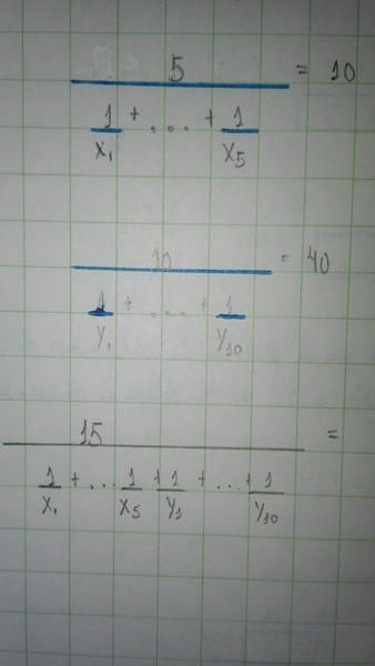 Calcular el promedio de 15 números , si la media armónica de 5 números es 10 y la media armónica de otros 10 números es 40.