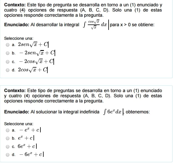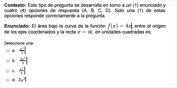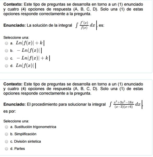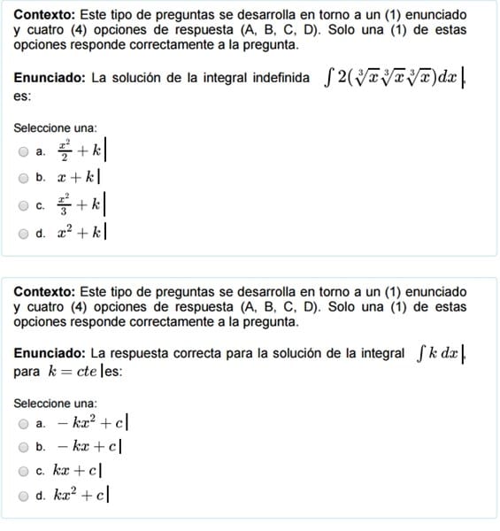 $$\begin{align}&A=\int_0^a4x \;dx= 2x^2\bigg|_0^a= 2a^2-0 = 2a^2\\&\\&\text{la respuesta es la d)}\\&\\&\\&\\&2) \int 2(\sqrt[3]x \sqrt [3] x \sqrt [3]x)dx=2\int \sqrt[3]{x·x·x}dx=\\&\\&2\int \sqrt[3]{x^3}=2\int x\;dx= 2·\frac {x^2}{2}+k = x^2+k\\&\\&\text{la respuesta es la d)}\\&\\&\\&\\&3) \int k\;dx =kx+c\\&\\&\text{La respuesta es la c}\\&\\&\\&\\&4)\int \frac{f'(x)}{f(x)}dx = ln|f(x)|+k\\&\\&\text{La respuesta es la a)}\\&\\&\\&\\&5)\int \frac{x^3+3x^2-18x}{(x-3)(x+6)}dx=\\&\\&=\int \frac{x(x^2+3x-18)}{(x-3)(x+6)}dx=\\&\\&\text{Ahora factorizamos el numerador con la fómula}\\&\\&(x+a)(x+b) = x^2+(a+b)x+ab\\&\\&=\int \frac{x(x-3)(x+6)}{(x-3)(x+6)}dx=\int x\;dx=\frac {x^2}2+C\end{align}$$