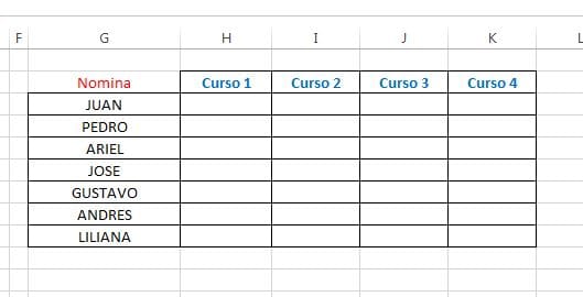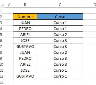En la columna C, tengo una cantidad definida de "cursos", es decir, nombres de cursos (Curso 1, curso 2... Etc)
