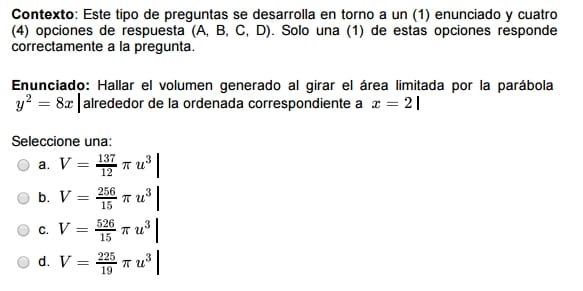$$\begin{align}&V=\pi \int_{y_1}^{y_2}f(y)^2dy\\&\\&V=\pi\int_{-4}^4 \left(\frac{y^2}{8}-2 \right)^2dy=\\&\\&\text{Como vemos que es simétrica respecto al eje x}\\&\\&2\pi\int_0^4 \left(\frac{y^2}{8}-2 \right)^2dy=\\&\\&2\pi\int\left(\frac{y^4}{64}-\frac {y^2}2+4 \right)dy=\\&\\&2\pi\left[\frac {y^5}{5·64} -\frac{y^3}6+4y \right]_0^4=\\&\\&2\pi\left(\frac{1024}{5·64}-\frac{64}{6}+16 \right)=\\&\\&2\pi \left(\frac {16}5-\frac{32}{3}+16 \right)=\\&\\&2\pi\left(\frac {48-160+240}{15} \right)= 2·\frac {128}{15}\pi=\frac {256}{15}\pi u^3\end{align}$$Luego la respuesta es la b)