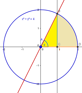 $$\begin{align}&A= \frac{arctg \,2}{2}·2^2=2\,arctg\,2\approx 2.214297436\,u^2\end{align}$$No olvidar poner en radianes la calculadora al hacer ese cálculo.