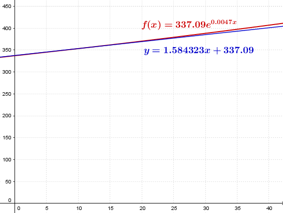 Para pensar esta función de crecimiento se considera el año 1980 como el inicio de la medición de tiempo, es decir, se toma como t = 0, a partir de este punto comienza a avanzar la variable temporal, por último se ajustan las escalas para que los ejes tengan el mismo tamaño entre cada valor, esto, porque es la forma más común de trabajarlo, de manera que la gráfica resultante es: