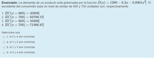 $$\begin{align}&EC(x_0)=\int_0^{x_0} (D(x)-y_0) dx= \int_0^{x_0} D(x)\;dx-x_0y_0=\\&\\&\int_0^{x_0}(1200-0.2x-0.0001x^2)dx-x_0(1200-0.2x_0-0.0001x_0^2)=\\&\\&1200x_0-0.1x_0^2-\frac{0.0001x_0^3}{3}-1200x_0+0.2x_0^2+0.0001x_0^3=\\&\\&\frac{0.0002}{3}x_0^3+0.1x_0^2\\&\\&EC(x_0=600)=\frac{0.0002}{3}600^3+0.1·600^2=50400\\&\\&EC(x_0=700)=\frac{0.0002}{3}700^3+0.1·700^2=71866.6666...\end{align}$$Luego las respuestas buenas son la 3 y 4, la respuesta es la d)