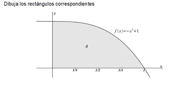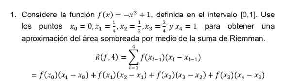 $$\begin{align}&R(f,4)=f(x_0)(x_1-x_0)+f(x_1)(x_2-x_1)+f(x_2)(x_3-x_2)+f(x_3)(x_4-x_3)=\\&\\&\text {hacemos cálculos aparte}\\&\\&f(x_0)=f(0) = -0^3+1=1\\&f(x_1)= f\left(\frac 14 \right)=-\frac 1{64}+1=\frac{63}{64}\\&f(x_2)=f\left(\frac 12 \right)=-\frac{1}{8}+1=\frac 78\\&f(x_3) = f\left(\frac 34 \right)=-\frac{27}{64}+1=\frac{37}{64}\\&x_1-x_0=\frac 14\\&x_2-x_1=\frac 12 - \frac 14= \frac 14\\&x_3-x_2=\frac 34 - \frac 12 = \frac 14\\&x_4-x_3=1-\frac 34 = \frac 14\\&\\&\text{Luego la suma de Rieman es}\\&\\&= 1·\frac 14+\frac{63}{64}·\frac 14+\frac{7}{8}·\frac 14+\frac{37}{64}·\frac 14=\\&\\&\frac 14\left(1+\frac{63}{64}+\frac{7}{8}+\frac{37}{64} \right)=\\&\\&\frac 14·\frac{64+63+56+37}{64}= \frac 14·\frac{220}{64}=\frac{220}{256}=\frac{55}{64}\\&\\&\end{align}$$