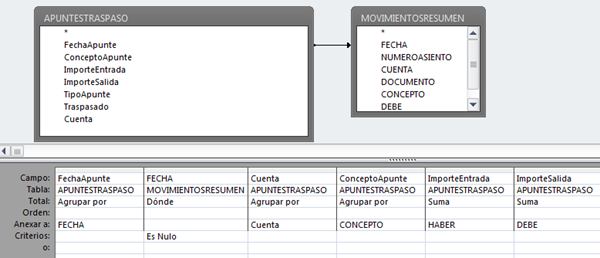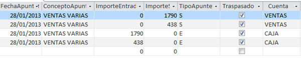 Tengo una tabla que recoge lo apuntes de la Gestión y están agrupados que todos los apuntes con el mismo concepto están sumados por cada día y estos han de ir al campo: TotalEntradas hay otros apuntes que también están sumados y que han de colocarse en el campo: TotalSalidas.