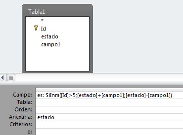 En este caso voy a anexar de la Tabla1 al campo "estado" de la Tabla2. Para aquellos registros de Tabla1 en los que el valor del campo "Id" sea mayor que 5, anexaré el valor del resultado de sumar los valores de los campos "estado" y "campo1", cuando no se cumpla la condición anexaré el valor resultado de restar los valores de esos campos.