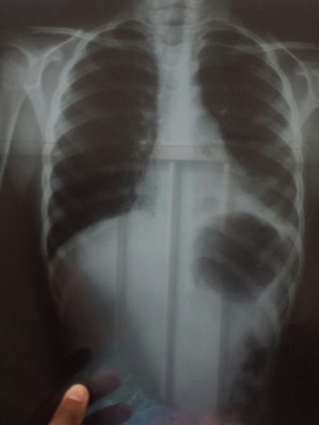 Hace un par de semanas que mi hija tiene problemas respiratorios, ha estado sometida a fiebre, y hemos ido con distintos especialistas que nos han recomendado que le hagamos nebulizaciones cada cuatro horas, últimamente la situación empeoró y en la ultima radiografía apareció una macha blanca en su torax (Adjunto imagen).