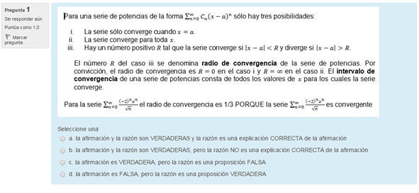 Vamos a elegir la respuesta d por ser la más parecida a la verdad. La afirmación es falsa porque el radio de convergencia es otro del que dicen y la serie es convergente, pero no en todo R.