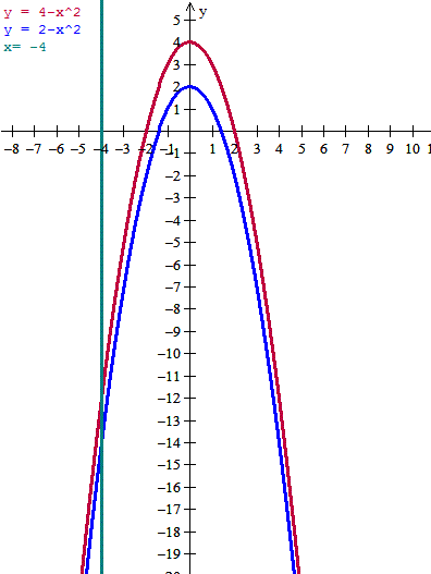 Calcula el volumen del sólido que tiene como base el plano xy acotado por la parábola y=4 - x^2 y la línea recta descrita por la ecuación y= 2 -x^2. En la parte superior del sólido está acotado por el plano z=x+4
