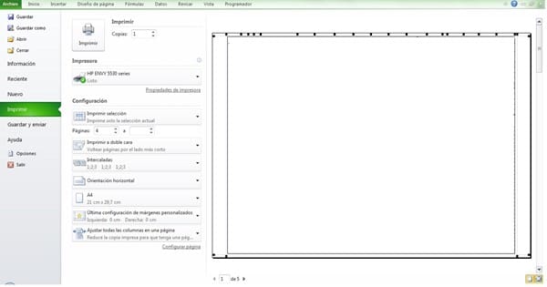 De nuevo nuevamente tengo que pedir ayuda, veréis tengo una lista de 5 hojas en excel que me cabe en un folio horizontal, pero cuando le voy a dar a imprimir me recorta como dos centímetros a cada lado del folio, con lo que no me deja imprimir a escala normal. He configurado los margenes y hecho todo tipo de cambios y no consigo que desaparezcan los topes de izquierda y derecha para que imprima a página completa. Alguien me puede decir que he hecho mal, necesito imprimir el trabajo, gracias.