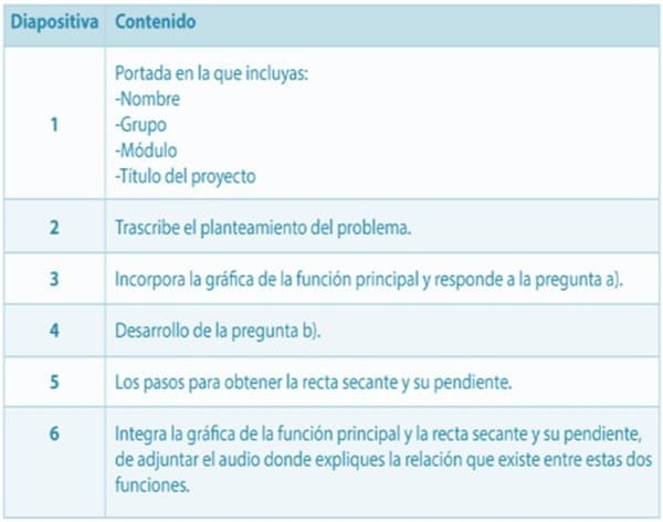 Una presentación con diapositivas donde respondas a los planteamientos realizados: la gráfica de la función principal, tu respuesta a las preguntas del punto dos, las gráficas que representan la recolección de tapas y la ecuación de la recta secante con su pendiente, con tu explicación en un audio.