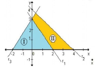 $$\begin{align}&m =\frac{y_2-y_1}{x_2-x_1}=\frac{0-3}{2-0}=- \frac{3}{2}\\&\\&r_1: \ \ y=- \frac{3}{2}x+3\end{align}$$r2: b=4 (corte con el eje Y)