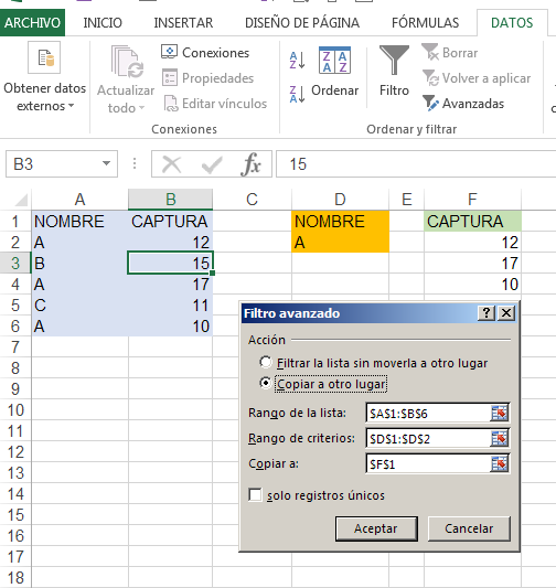 Luego, en el rango "Copiar a:" marca las celdas de títulos donde se generará la nueva tabla.