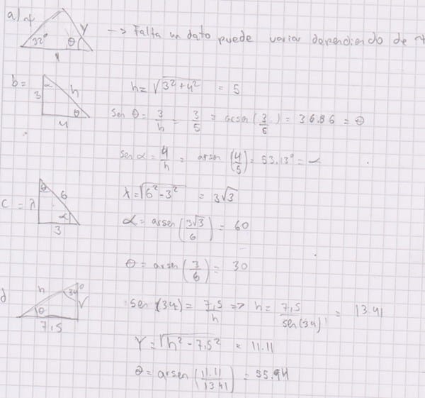 Para cada uno de los siguientes triángulos rectángulos halla todos sus lados y ángulos con los datos dados