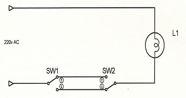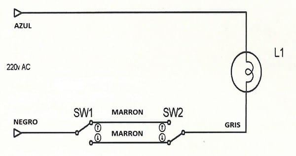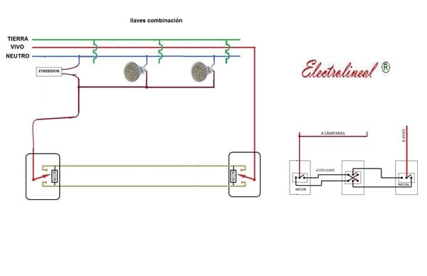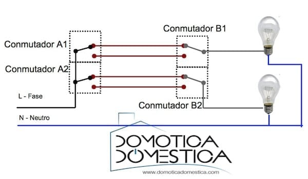 Quiero poner en el salón una lampara con 6 luces y quiero que con un doble conmutador en una parte y otro en otra parte se pueda encender con uno 3 bombillas y desde el otro se pueda apagar ese y/o encender los otros 3, ¿qué debería ser las conexiones en las dos dobles conmutadas?