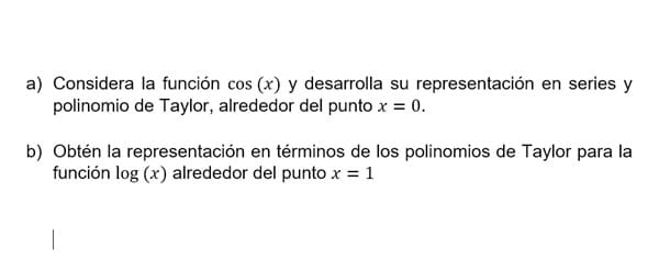 $$\begin{align}&\text{Primero vamos a calcular unas cuantas derivadas, para ver la forma que tienen:}\\&(cosx)' = -sinx\\&(cosx)''=(-sinx)' = -cosx\\&(cosx)''' = (-cosx)' = sinx\\&(cosx)^{iv} = (sinx)' = cosx\\&\text{y a partir de este punto volvemos a empezar}\\&\text{Como el punto en cuestión es x=0, sabemos que:}\\&\cos(0) = 1, \sin(0) = 0 \text{...por lo tanto vemos que se anulan los términos de las derivadas del seno (las de orden impar) y las de orden par van cambiando de signo alternadamente}\\&\text{Término general (para x=0)}\\&P(x) = f(0) + \frac{f'(0)x}{1!}+ \frac{f''(0)x^2}{2!}+ \frac{f'''(0)x^3}{3!}+ ...= \sum_{i=0}^n \frac{f^i(0)x^i}{i!}\\&\text{si consideramos que la función la podemos escribir como:} f(x)= f^{0}(x)\\&{En particular, ya vimos que tenemos muchos términos que se anulan y otros que van cambiando entre 1 y -1, por lo que tendríamos}\\&P(x) = \cos(0) + \frac{-\sin(0)x}{1!}+ \frac{-\cos(0)x^2}{2!}+ \frac{\sin(0)x^3}{3!}+ \frac{\cos(0)x^4}{4!}+ ...\\&\text{En particular, ya vimos que tenemos muchos términos que se anulan y otros que van cambiando entre 1 y -1, por lo que tendríamos}\\&P(x) = 1 - \frac{x^2}{2!}+ \frac{x^4}{4!}-\frac{x^6}{6}+ ...=\sum_{i=0}^{n} \frac{(-1)^{i}x^{2i}}{(2i)!}\end{align}$$Salu2