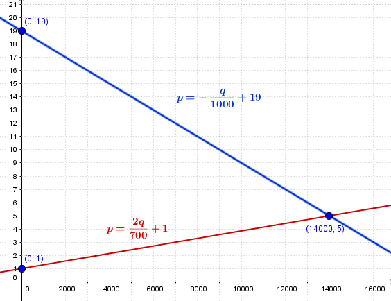 $$\begin{align}&\frac{q-q_1}{q_2-q_1}=\frac{p-p_1}{p_2-p_1}\\&\\&\frac{q-14000}{0-14000}=\frac{p-5}{1-5}\\&\\&\frac{q-14000}{-14000}=\frac{p-5}{-4}\\&\\&\frac{q-14000}{14000}=\frac{p-5}{4}\\&\\&p-5 = \frac{4(q-14000)}{14000}\\&\\&p =\frac{4q-56000}{14000}+5\\&\\&p=\frac{4q-56000+70000}{14000}\\&\\&p=\frac{4q+14000}{14000}\\&\\&\text{Luego la ecuación de la oferta es}\\&\\&p=\frac {2q}{7000} +1\\&\\&----\\&\\&b) \text{ Y la demanda pasa también por (0,19)}\\&\\&\frac{q-14000}{0-14000}=\frac{p-5}{19-5}\\&\\&\frac{q-14000}{-14000}=\frac{p-5}{14}\\&\\&\frac{-q+14000}{1000}=p-5\\&\\&-q+14000=1000p-5000\\&\\&1000p=-q+19000\\&\\&\text{Y la de la oferta es}\\&\\&p=-\frac q{1000}+19\end{align}$$El punto de equilibrio es (14000, 5)