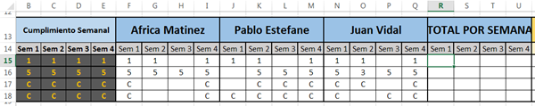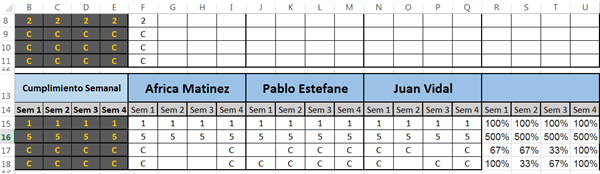 La fórmula matricial que te propongo, evaluaría el cumplimiento promedio de la fila 16 arrojando como resultado 3.33 (5+0+5 dividido 3 personas, para la semana 1):