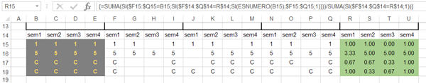 {=SUMA(SI($F16:$Q16=B16;SI($F$14:$Q$14=R$14;SI(ESNUMERO(B16);$F16:$Q16;1))))/SUMA(SI($F$14:$Q$14=R$14;1))}