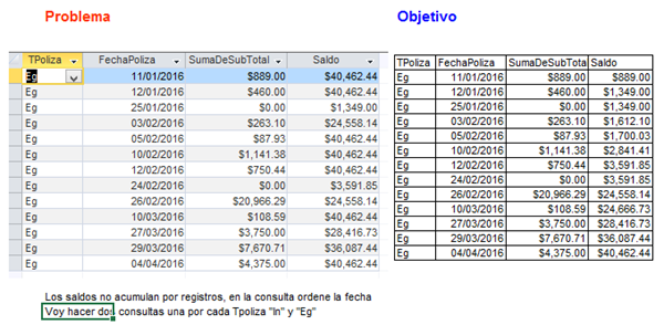 SELECT tblPoliza.TPoliza,tblPoliza.FechaPoliza, tblPoliza.SubTotal, Format(DSum("tblPoliza.[SubTotal]","tblPoliza","tblPoliza.[FechaPoliza] <=#" & [tblPoliza].[FechaPoliza] & "#"),"$#,##0.00") AS Acumulado