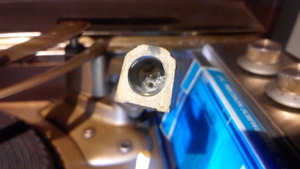 Luego el cable gris que aparece abajo en la imagen, va conectado al pin número 4 de la pastilla y su extremo contrario al perno más pequeño del cabezal, por lo que el cable que sale entre la cubierta del cable va conectado al pin 3 de la pastilla y al otro perno grande (Perno núm 2 del cabezal), lo que hace pensar que ese perno número 2 del cabezal sirve de tierra.