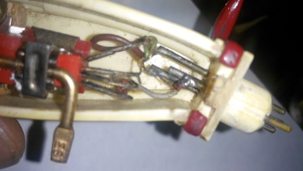 El cable rojo de arriba está conectado al 1er. pin de la pastilla y al primer perno del cabezal y el cable que sale de entre la cubierta roja está soldado al pin 2 de la pastilla y al otro perno grande del cabezal (Perno núm 2 del cabezal).