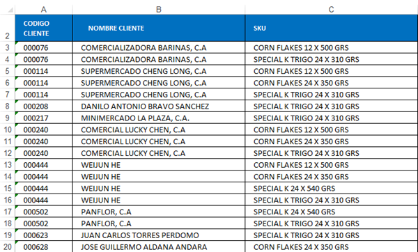 2º Ordena la tabla por los productos creciente (basta con desplegar el autofiltro y selecciona "Ordenar de la A a la Z") OJO: en este caso el producto CORN FLAKES de 350gr se considera diferente al de 500gr. Si quisieras tener la opción de poder considerarlo el mismo producto para o repetir el cliente te recomiendo que tu columna original del producto SKU la subdividas en dos columnas: producto y tamaño. En el ejemplo adjunto no he diferenciado los tamaños (por simplificar)