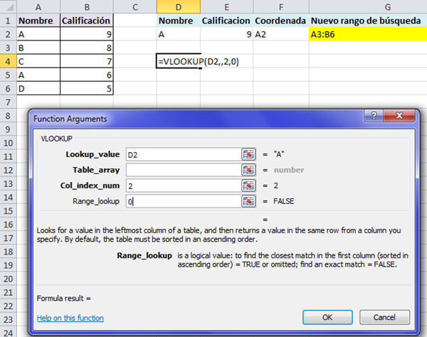 En la imagen tengo el cuadro de la función "buscarv", sólo que en el rango de búsqueda necesito indicar lo que diga una celda (en este caso G2). No puedo ingresarlo manualmente, ya que el valor de la celda G2 varia, depende del valor de la celda D2.