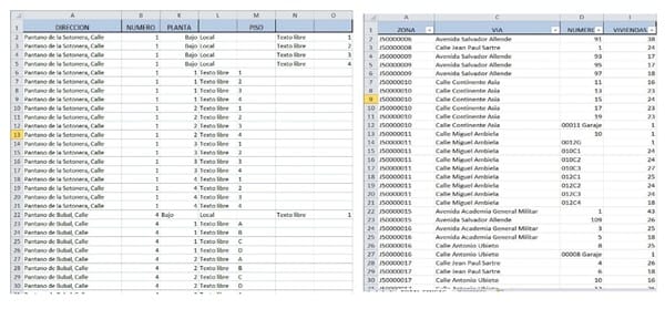 CASO1: En esta segunda pestaña sumando todos esos pisos de un mismo número coincide con el número de viviendas de la primera pestaña, tengo que ver si en un sitio hay 23 viviendas por ejemplo para una dirección y un portal pues que en la segunda pestaña al sumar todos los pisos ( uno por fila ) de ese mismo portal y dirección me dé también 23.