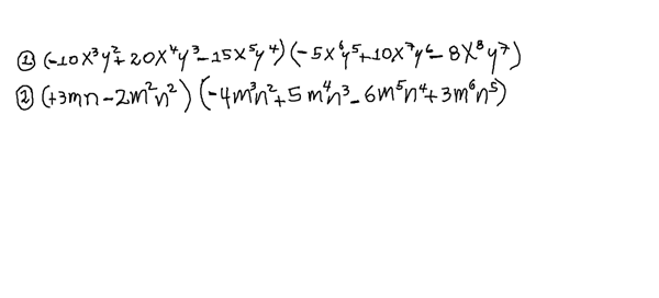 $$\begin{align}&(-10x^3y^2+20x^4y^3-15x^5y^4)(-5x^6y^5+10x^7y^6-8x^8y^7)=\\&\\&50x^9y^7-100x^{10}y^8+80x^{11}y^9-100x^{10}y^8+200x^{11}y^9-160x^{12}y^{10}+\\&75x^{11}y^9-150x^{12}y^{10}+120x^{13}y^{11}=\\&\\&\text{Y ahora si vemos términos semejantes los sumamos}\\&\\&= 50x^9y^7-200x^{10}y^8+ 355x^{11}y^9-310 x^{12}y^{10}+120x^{13}y^{11}\\&\\&\text{y si no nos gusta así porque queremos las x más grandes}\\&\text{al principio con dar la vuelta sale así.}\\&\\&\\&\\&(3mn-2m^2n^2)(-4m^3n^2+5m^4n^3-6m^5n^4+3m^6n^5)=\\&\\&-12m^4n^3+15m^5n^4-18m^6n^5+9m^7n^6+\\&+8m^5n^4-10m^6n^5+12m^7n^6-6m^8n^7=\\&\\&-12m^4n^3+23m^5n^4-28m^6n^5+21m^7n^6-6m^8n^7\\&\end{align}$$¡Hola Juan!