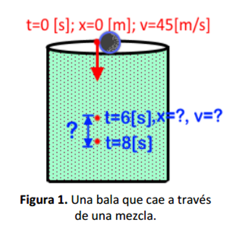 Problema: Se lanza una bala hacia abajo, a través de una mezcla que contiene arena y un líquido. Al pasar a través de la mezcla, la bala sufre una aceleración negativa igual a: a= -0.25 v3 [m/s2]. La velocidad inicial de la bala es de 45 [m/s]. Después de 6 segundos de ser lanzada ¿cuál es la posición y la velocidad de la bala? Si transcurren 2 segundos más: ¿cuál es el desplazamiento que hubo en este pequeño intervalo?.