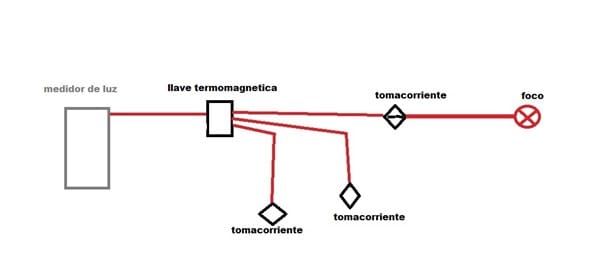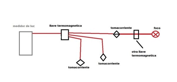 El problema es el siguiente, cada vez que enchufo el foco de un ambiente especifico donde esta ilustrado, me produce un corto (al momento o después de unos minutos a veces media hora o una hora)y la llave termomagnética se apaga, produciéndome fastidio para mi y para los demás ambientes, bueno sera fácil decir que la vuelvo a subir la llave y asunto arreglado, o que averigüe la falla y listo, pero es casi imposible por que no tengo acceso al ambiente donde esta la llave general, y lo otro el ambiente donde se produce el corto esta enterrado, solamente con la figura he tratado de hacerlo más fácil la explicación porque en realidad es más complicado de como esta instalado la corriente.