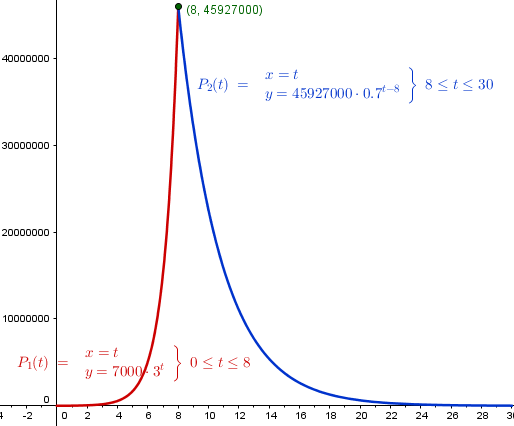 Una especie de mosquitos de una isla africana se reproduce triplicandose cada 24hs, al cabo de 8 días de arribar a la isla un equipo de investigadores, consigue implementar un sistema de fumigación que afecta a la especie de tal forma que impide su reproducción, y la población empieza a decrecer en un 30% diario. Si cuando llegaron los investigadores, estimaron una existencia de 7000 mosquitos, se pide: