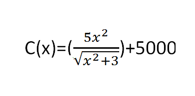 $$\begin{align}&\left( \frac fg\right)'=\frac{f'g-fg'}{g^2}\\&\\&(\sqrt x)'=\frac{1}{2 \sqrt x}\\&\\&(f[g(x)])'=f'[g(x)]·g'(x)\\&\\&\\&C(x)= \frac{5x^2}{\sqrt{x^2+3}}+ 5000\\&\\&C'(x)=\frac{10x \sqrt{x^2+3}-5x^2·\frac{1}{2 \sqrt{x^2+3}}·2x}{x^2+3}+0=\\&\\&\frac{10x \sqrt{x^2+3}-\frac{5x^3}{\sqrt{x^2+3}}}{x^2+3}=\\&\\&\frac{10x(x^2+3)-5x^3}{(x^2+3) \sqrt{x^2+3}}=\\&\\&\frac{10x^3+30x-5x^3}{(x^2+3) \sqrt{x^2+3}}= \frac{5x^3+30x}{ \sqrt{(x^2+3)^3}}\\&\end{align}$$Y eso es todo, sa lu dos.