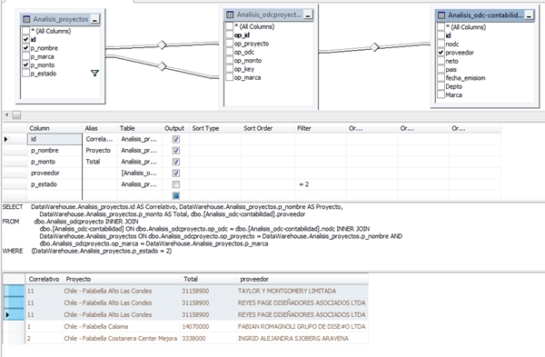 Lo que necesito es poder hacer una consulta donde en una fila me muestre el proyecto, y concatenar sus proveedores. Esta es la consulta que hago.
