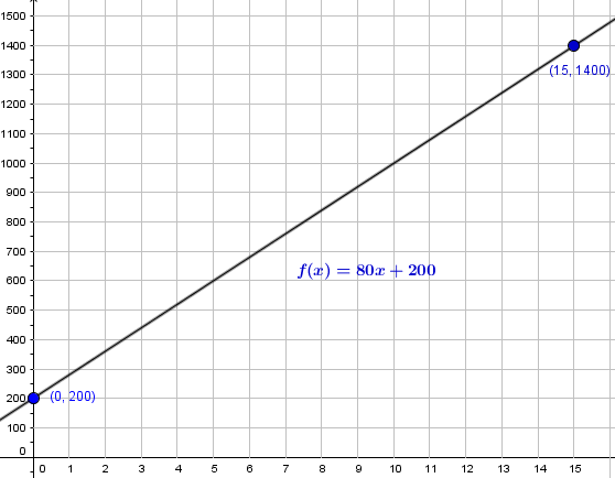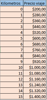 La tarifa de los taxis de una ciudad es de $200 por bajada de bandera y por cada kilómetro recorrido $80. A. Haz una tabla que exprese el precio del viaje según los kilómetros que se recorran. B. Encuentra la función que relaciona los kilómetros recorridos (x) y el precio del viaje (y). C. Representa dicha función. D. ¿Es una función lineal? ¿De qué tipo? ¿Cuál es el dominio?