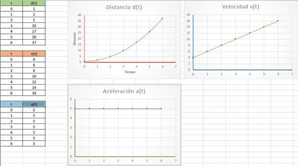 En el movimiento uniformemente acelerado se manifiestan 3 magnitudes: distancia, velocidad y aceleración. A partir de la relación de dichas magnitudes con el tiempo se establecen las siguientes funciones.