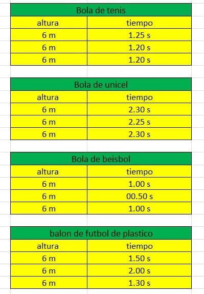 c. Realiza este paso al menos 3 veces con cada uno y anota cada tiempo en una libreta. Anota en una tabla los resultados que tuviste. Ahora, calcula el promedio de las mediciones de tiempo y realiza los cálculos para encontrar la altura con el valor promedio del tiempo.