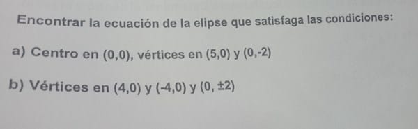 Encontrar la ecuación de la elipse de calculo vectorial, donde nos dan centro y vértices. Realizar los dos ejercicios propuestos. Que satisfagan las condiciones. Encontrar la ecuación de a elipse. Encontrar la ecuación de la elipse de calculo vectorial, donde nos dan centro y vértices. Realizar los dos ejercicios propuestos. Que satisfagan las condiciones. Encontrar la ecuación de a elipse