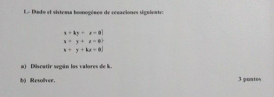 el apartado a. K=1 Rg(a)=rg(a*)=1 <nº incognitas sistema compatible indeterminado