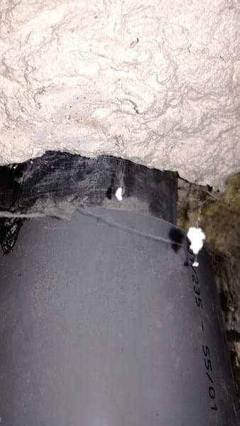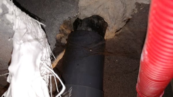 Después de romper el falso techo de escayola hemos podido observar cuál parece ser la causa del problema. Ambos tubos de PVC que llevan la ventilación de las bajantes y que deberían salir por la cubierta del edificio se cortan dentro de mi falso techo sin llegar a atravesar el forjado de la cubierta, y dentro de ellos se "emboca" lo que parece ser algo como tela asfáltica, pero simplemente metida dentro de las bajantes sin sellar ni nada. De hecho llega a haber hueco de varios cm donde se pueden meter los dedos sin problemas. Adjunto fotos de estas "barbaridades" que creo que aclaran todo:
