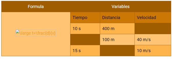 A partir de cada una de las fórmulas propuestas en las tablas, realiza los despejes correspondientes para obtener las variables faltantes y anotarlas en los recuadros sombreados.