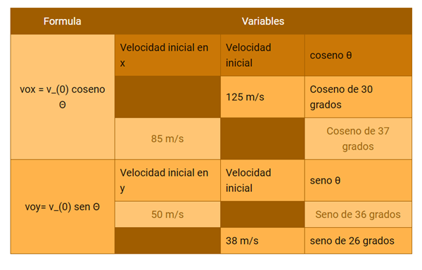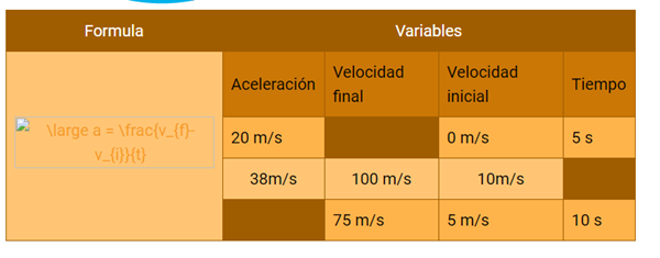 Incluye los ejemplos que expresen el tipo de movimiento representado en las diferentes fórmulas: velocidad, aceleración o tiro parabólico, respectivamente.