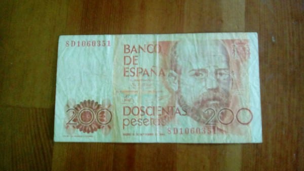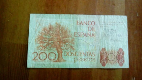 He encontrado este billete de 200 pesetas entre las hojas de un libro, tiene marcas de uso, pero esta en buen estado y además como estaba en un libro, esta bastante liso, he leído que la serie 8D es algo complicada de encontrar ( o eso he interpretado yo) agradecería que alguien me dijera el valor que puede tener y donde podría venderlo.