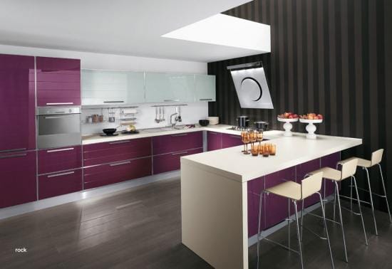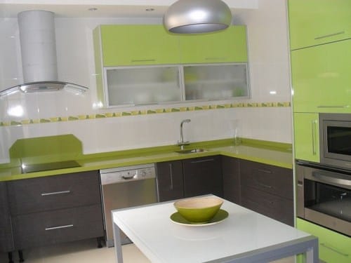 Sin embargo, si te decantas por un estilo contemporáneo y moderno puedes poner los muebles de colores intensos como el lavanda o verde y encimera de cuarzo blanca. El comedor podría ser con mesa de cristal y sillas blancas o mesa blanca y sillas de color verde o morado a juego con los muebles elegidos. Si te gusta este estilo, podrías incluso combinar con el blanco colores como el negro y el amarillo intenso.