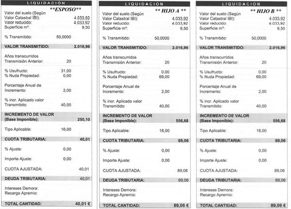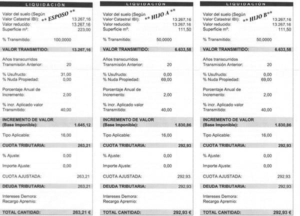 Fallece mi esposa. El ayuntamiento comunica la Plusvalía a los herdedoros: dos hijos comunes y yo. (Pongo dos situaciones: CASO 1: Un bien en Gananciales y CASO 2: Un bien Privativo de mi esposa fallecida. Entiendo que existen errores en ambos caso al entender que no se cumple la fórmula: Valor pleno dominio = valor nuda propiedad + valor usufructo . (Los datos aportados son reales)