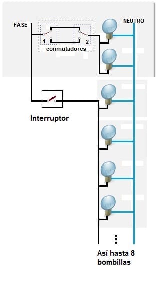 Tengo una línea de luz de 230v, y quiero hacer que las dos primeras lámparas de exterior se enciendan con doble conmutador y las siguientes 8 se enciedan con un solo interruptor. ¿Es posible o me faltaría otra línea de alumbrado?