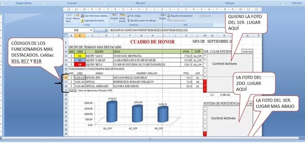 Debo hacer una Evaluación Diaria a varios Funcionarios, ya tengo la forma y Planilla que me dá la información, lo único que necesito es que el Informe Final con los resultados, a través del Código asignado al funcionario y en uso del Macro me dé la foto tipo carnet que tengo en un carpeta, dicho ésto le indico: en la hoja3: en celda B16: el 1er. Lugar allí aparece el código del funcionario; en celda C16: EL Cargo; en D16: Nombres y Apellidos; E16: Cédula de Identidad; F16: departamento; G16: Puntos; H16: Ubicación... Y así hasta llegar a la letra N16: en donde habilité y combiné varias celdas con la finalidad de colocar o que aparezca automáticamente la foto tipo carnet, la cual la tengo archivada en una carpeta llamada COP.