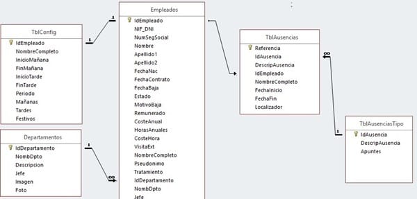 Estoy comenzando a adentrarme en bases de datos con access, estoy algo confundido espero me puedan orientar. Tengo la tabla datosempleado, tipo_movimiento, movimientos, en datsoempleado, ahí pongo nada más los puros datos, en tipo_movimiento, si es: alta, baja, reingreso, sanción, vacaciones, etc.; en la de movimientos, necesito ahí registrar los movimientos que tenga dicho empleado, para así poder generar un historial. Me podrían orientar como serian las relaciones entre tablas.